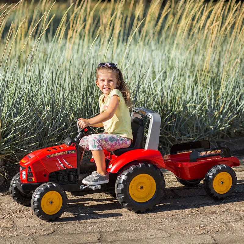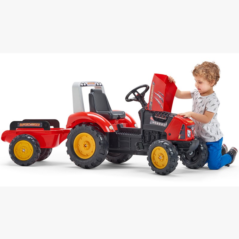 Traktor na pedały Supercharger od marki FALK w kolorze czerwonym to marzenie każdego małego ogrodnika i fana maszyn rolniczych. Ten solidny pojazd został w 100% wyprodukowany we Francji, co gwarantuje najwyższą jakość wykonania i dbałość o detale. Traktor charakteryzuje się realistycznym designem, który przyciąga wzrok i zachęca do aktywnej zabawy na świeżym powietrzu. Wyposażony w otwieraną przednią maskę, pozwala dziecku poczuć się jak prawdziwy mechanik sprawdzający stan silnika przed wyruszeniem w pole. W zestawie znajduje się pojemna, jednoosiowa przyczepa, która idealnie nadaje się do transportu piasku, liści czy ulubionych zabawek. Dzięki skrętnej przedniej osi i kierownicy z wbudowanym klaksonem, manewrowanie traktorem jest proste i dostarcza mnóstwo frajdy. Supercharger to nie tylko zabawka, ale narzędzie do budowania kondycji fizycznej i koordynacji ruchowej dziecka, zapewniając bezpieczną rozrywkę przez wiele sezonów.