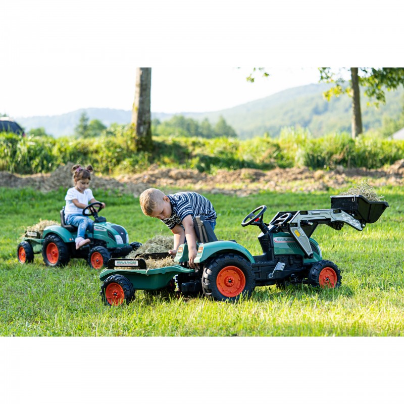 Traktor na pedały Farm Lander w pięknym odcieniu zieleni w stylu vintage to idealny pojazd dla małych ogrodników! Został specjalnie zaprojektowany, aby zapewnić dzieciom godziny aktywnej i rozwijającej zabawy na świeżym powietrzu. Manewrowanie nim to czysta przyjemność, a dołączona do zestawu pojemna przyczepka pozwala na wygodne transportowanie ulubionych skarbów, owoców z sadu czy warzyw z przydomowego ogródka.Co niezwykle ważne, ten fantastyczny pojazd został wyprodukowany we Francji i składa się w 60% z plastiku pochodzącego z recyklingu, co czyni go wyborem przyjaznym dla środowiska. Regulowane siedzenie oraz możliwość personalizacji tablicy rejestracyjnej sprawiają, że traktor bez problemu rośnie razem z dzieckiem i staje się jego unikalnym środkiem transportu.
